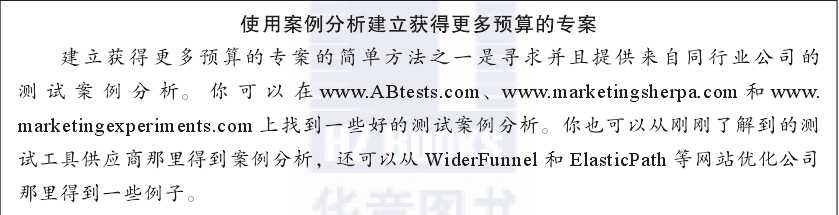 你往往需要为高级管理层建立一个案例,以获得较高的预算,最好的办法就是制作个简短的演示文稿供他们审核。为了使这个演示文稿达到最佳效果,它应该强调使用测试工具在第一年中的预期投资回报率、潜在的高转化率以及对高管来说最重要的一一与转化率提升相关的收入増长(即使最基本的2%提提升,通通常也会给收入带来很大的增长)。