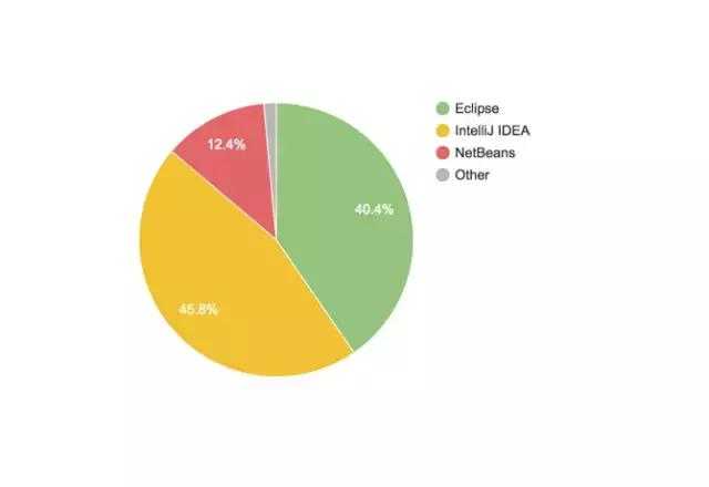 对应的是sublime、atom……从这个角度讲,VSCode无疑是最成功的,正在蚕食竞争对手的市场。而JetBrains系列对应的是VisualStudio。如果按语言区分,Java(Android)阵营的IDE正在被JetBrains蚕食。从去年(2016)IntelliJIDEA就超越了Eclipse,下图是今年的份额: