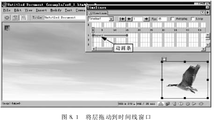 (1)在页面中添加一个新层,在层中插入图像ing8-2,gif,然后将层移动到动画的起始位置。
