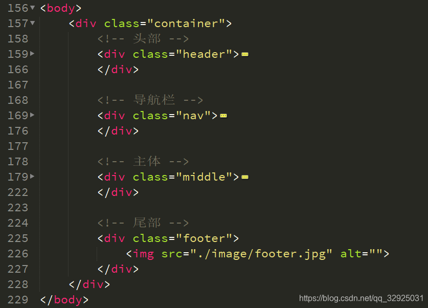 网页划分为5大核心模块,DIV为容器,导航用UL+LI构建,核心代码如下: