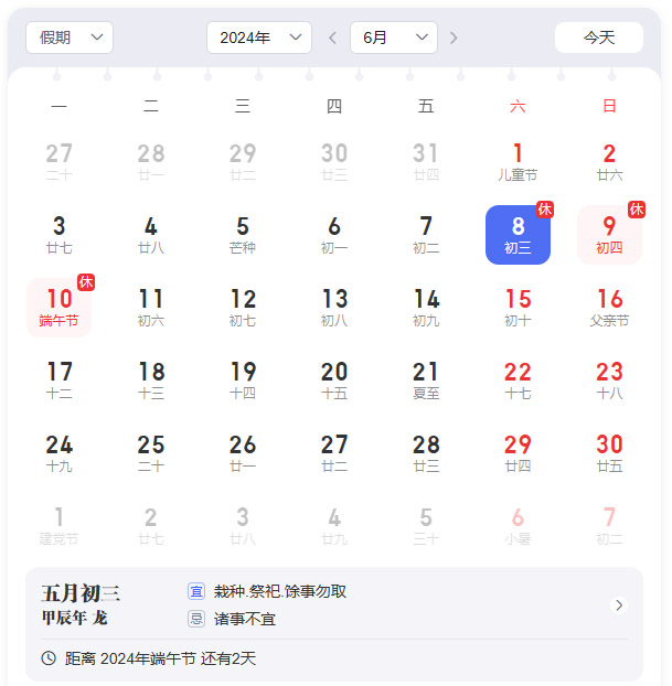 放假时间:2024年6月8日(周六)——2024年6月10日(周一),共三天。